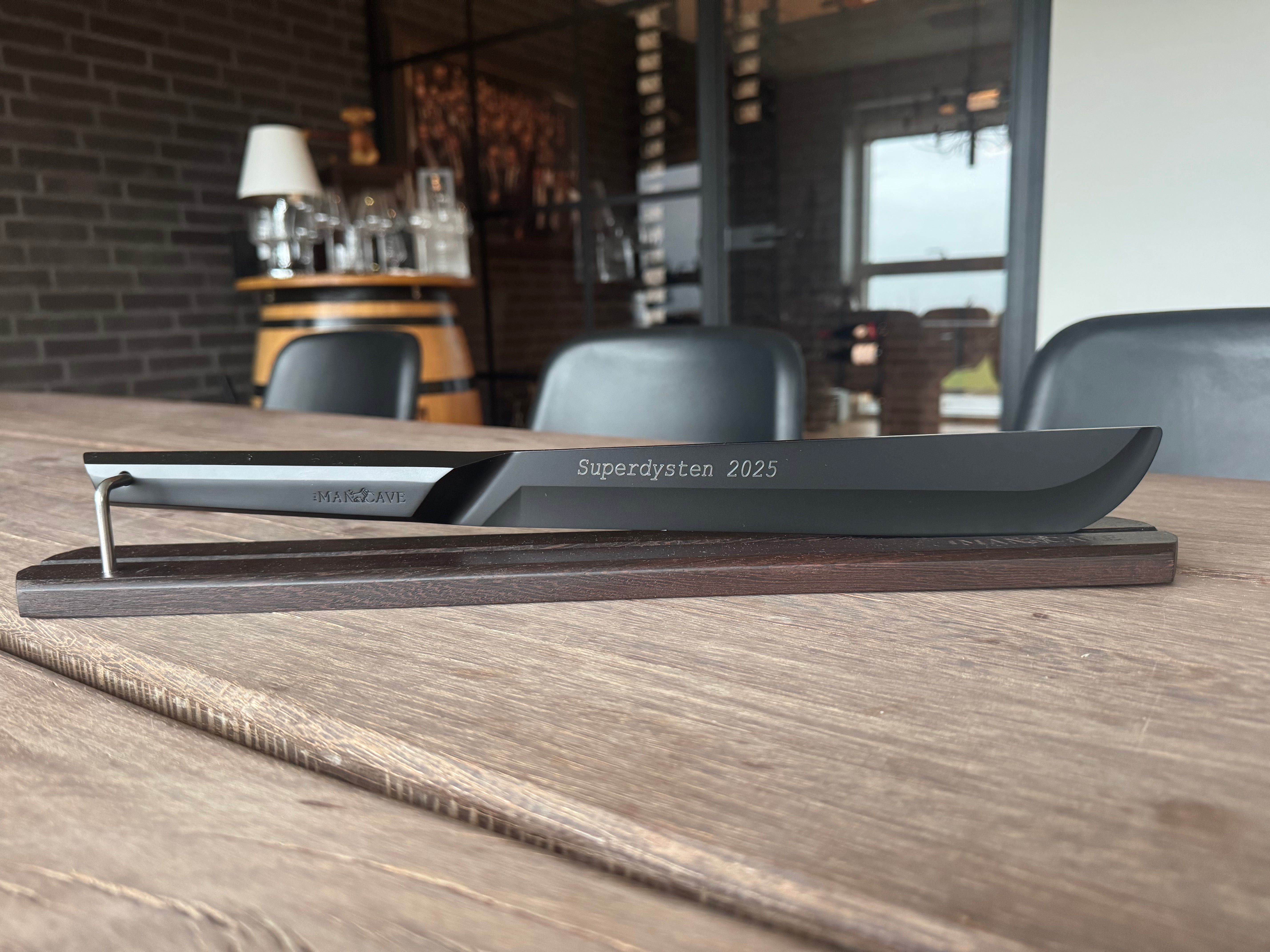 Hver sabel leveres med en elegant holder i eksklusivt wengé-træ – kendt for sin dybe farve og lange, lige åretegninger. Holderen komplementerer sablens design og præsenterer den med stil. Når sablen står i holderen, flugter klingen perfekt med den slanke profil, hvilket gør den til et ægte blikfang i ethvert rum eller hjemmebar.